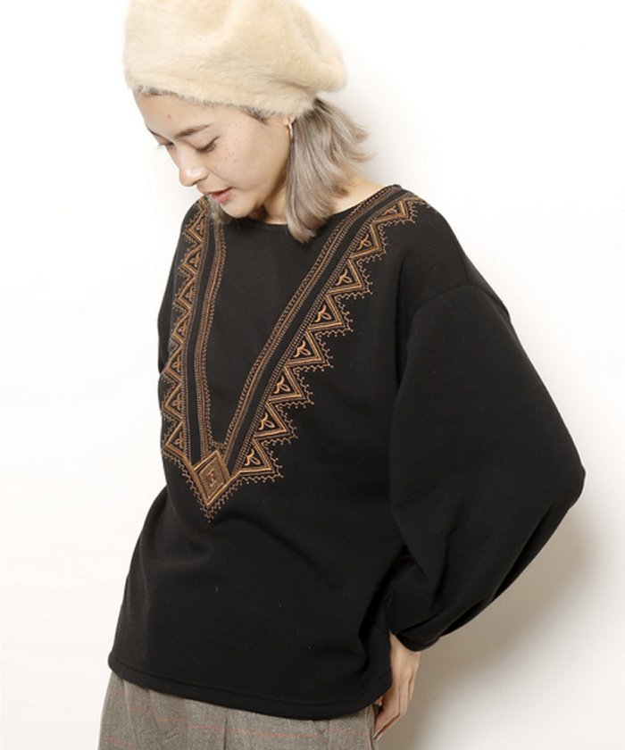 シンプルにワントーンカラーでまとめた刺繍でスタイリッシュにエスニックテイストを盛り込んだプルオーバー。袖口にタックを寄せて膨らませたボリューム袖がレディな表情をさりげなくプラス。お手持ちのデニムやチノパンとも好相性の1枚です。