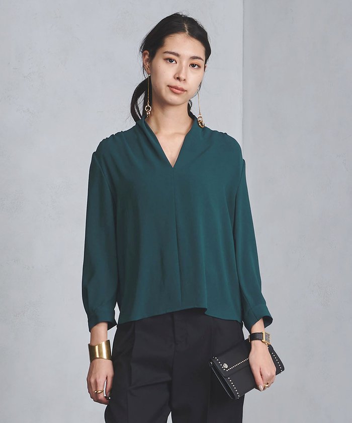 固くなり過ぎない柔らかな雰囲気が魅力のVネックブラウス。