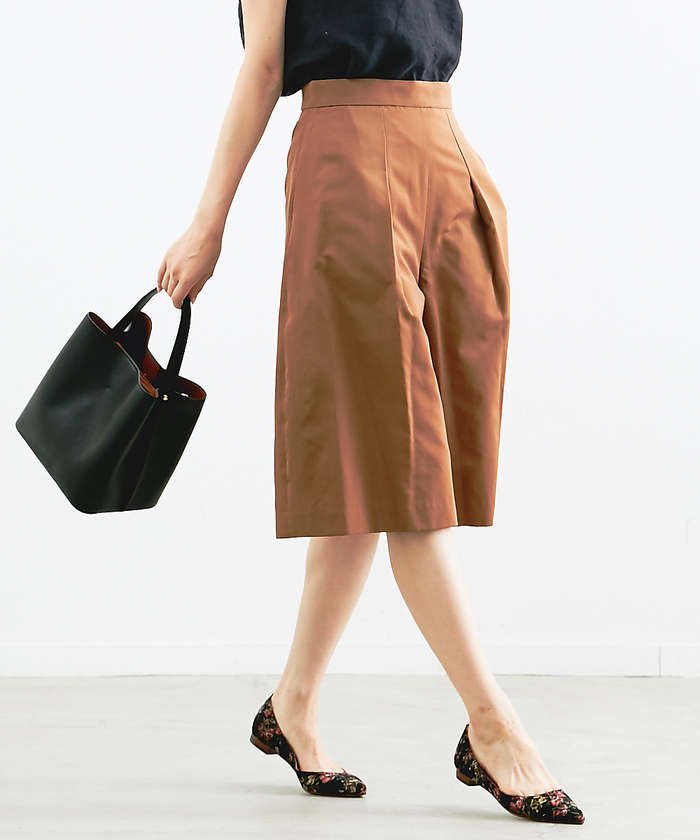 光沢があるグログラン織りの生地を使ったキュロットパンツ。アクティブな印象になりがちなアイテムですが、きれいめな素材なので大人っぽく履けます。スカート見えするシルエットは、この春夏もトレンドとして継続。トップスはウエストインして着こなすのがおすすめです。