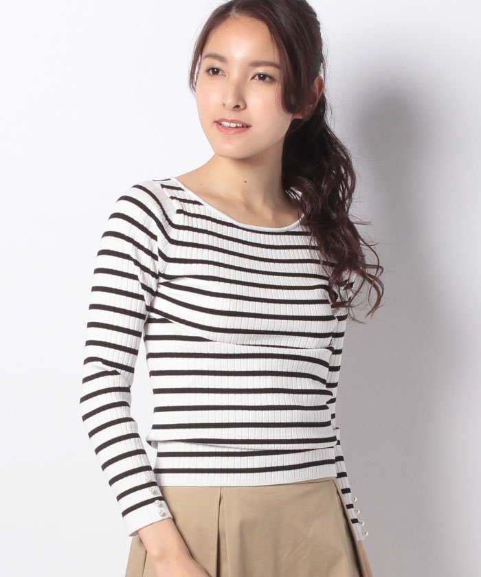 装いのモダンなアクセントにも映える、ボーダー柄ニットが登場!カジュアルなベースながら袖口にパールビーズを添えて品良くメリハリ付け◎ボトムスINもOUTもスマートにマッチする1枚は、ワードローブの即戦力として幅広い活躍が期待できそう。
