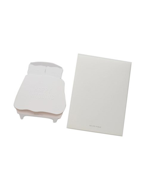 親しい間柄の人たちの、結婚をお祝いするのに相応しいギフトカード。ベッドの上に置かれているアイテムに、型押しされたロゴもポイントです。折り畳まれたところをめくっていくとハートマークに描かれた、congratulationsのメッセージがでてくる仕掛けも素敵。